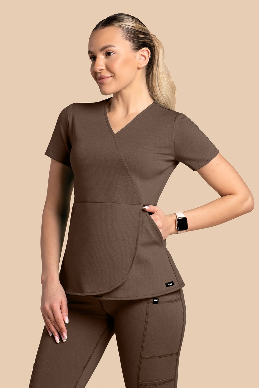 Przedstawiamy scrubs damski brązowy od S4W. Nowy zestaw Tulip + Yoga Pants zrobiony z oddychającego i wyjątkowo miękkiego materiału, który dopasowuje się do ciała niczym druga skóra. Świetnie podkreśla talię oraz zakrywa niedoskonałości. Zwróć uwagę na detale Yoga Pants: stylowe szwy boczne, ukryta tylna kieszeń na zamek i aż cztery boczne kieszenie. Cały komplet medyczny podkreśla piękno każdej kobiecej sylwetki. Perfekcyjny scrubs brązowy. Jesteś gotowa na idealny look?